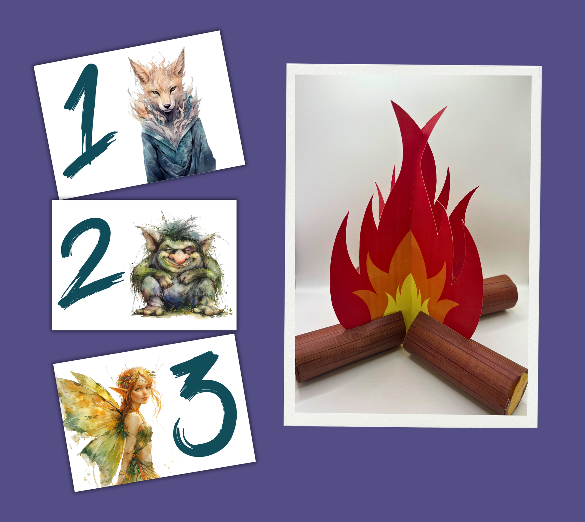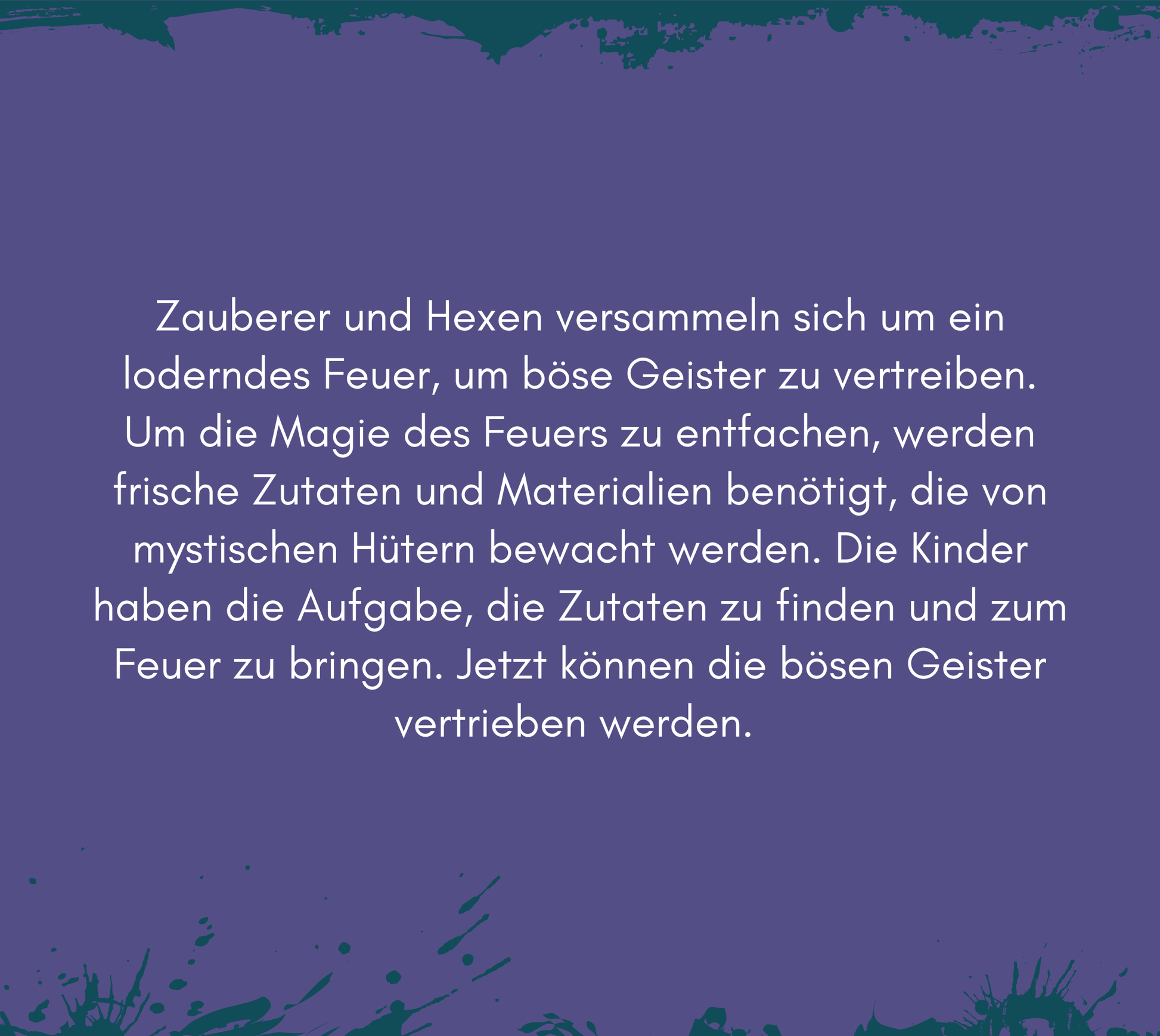 Heute ist ein besonderer Tag. Zauberer und Hexen versammeln sich um ein loderndes Feuer, um böse Geister zu vertreiben. Um die Magie des Feuers zu entfachen, werden frische Zutaten und Materialien benötigt, die von mystischen Hütern bewacht werden. Die Kinder haben die Aufgabe, die Zutaten zu finden und zum Feuer zu bringen. Mit dem Feuer können dann die bösen Geister vertrieben werden.